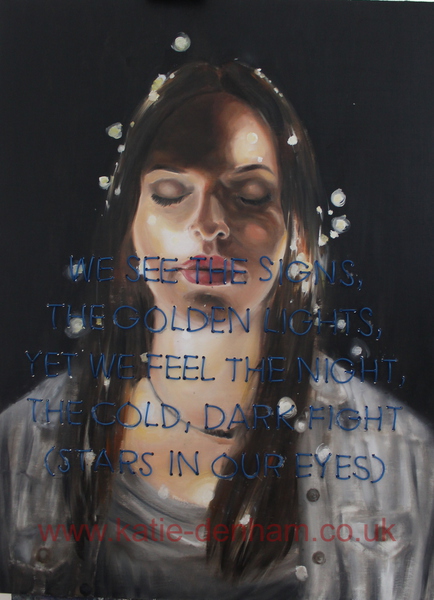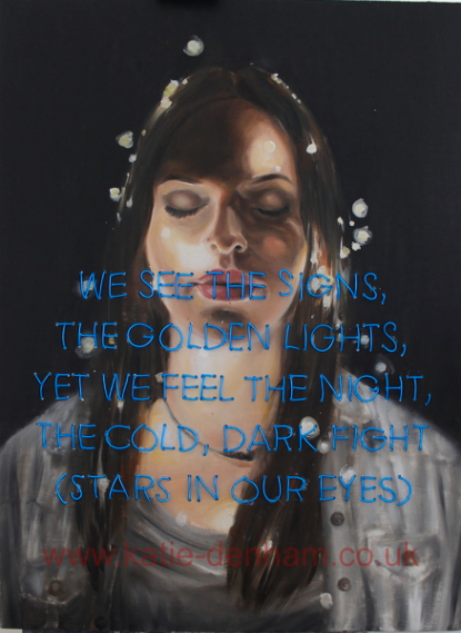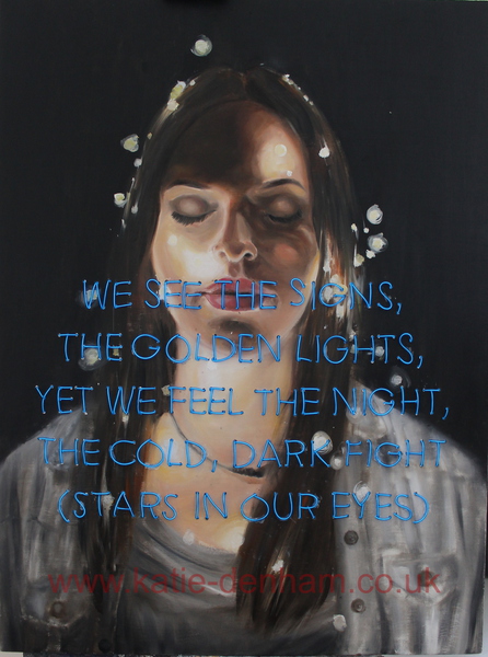 Stars In Our Eyes is an oil portrait on panel with electroluminescent detailing. It explores our relationship to reality and the world around us.